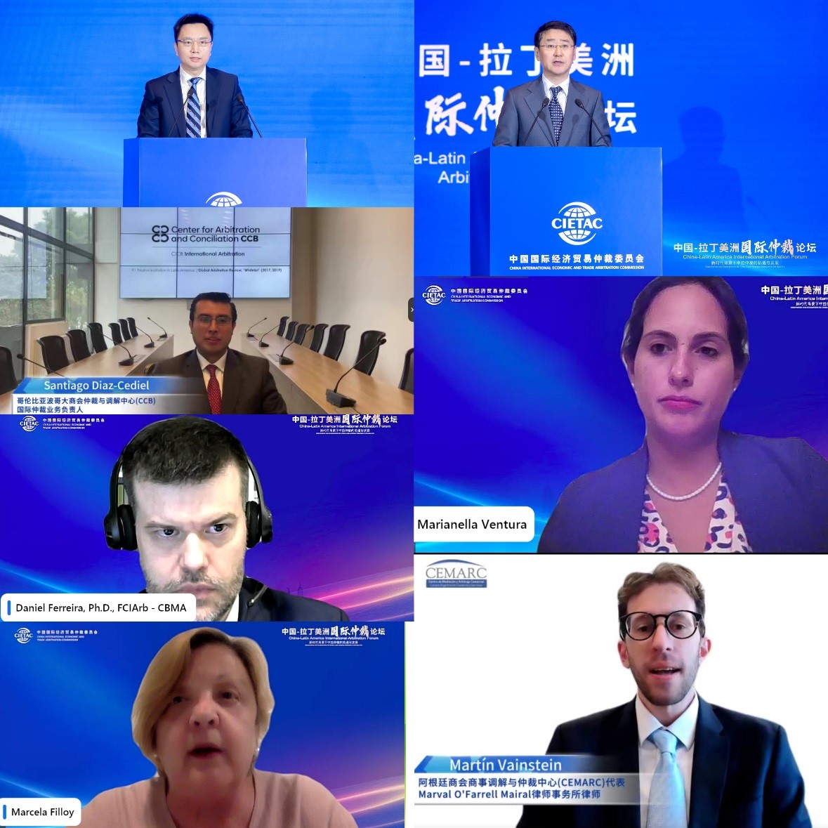 (议题一主持人及演讲嘉宾,从上到下、从左至右分别为:中伦律师事务所高级顾问、贸仲仲裁员赵健,哥伦比亚波哥大商会仲裁与调解中心国际仲裁业务负责人 Santiago Diaz-Cediel , 巴西仲裁和调解中心CEO Daniel Brantes Ferreira,哥斯达黎加律师协会仲裁与调解中心前理事会成员Marcela Filloy,贸仲仲裁院副院长谷岩,利马商会仲裁中心秘书长 Marianella Ventura Silva, 阿根廷商会商事调解与仲裁中心代表、Marval O’Farrell Mairal律师事务所律师Martín Vainstein)