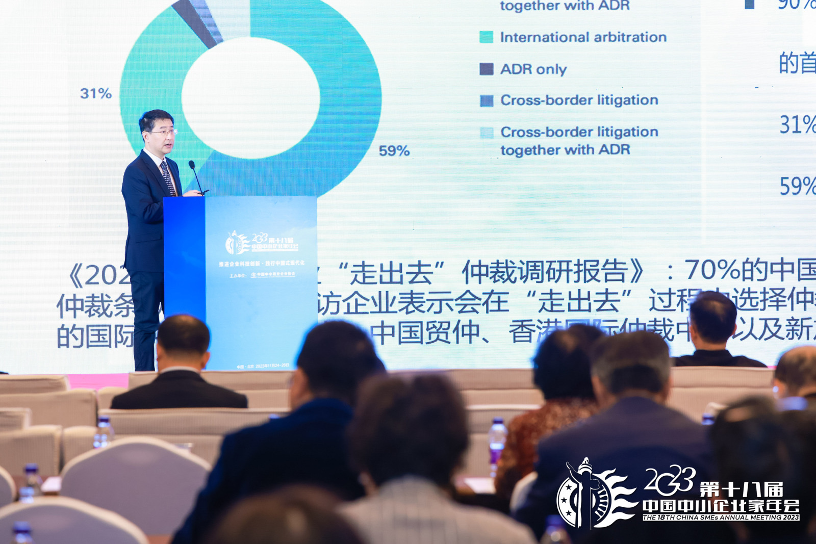 2023年11月24日,第18届中国中小企业家年会之第七届中国中小企业权益保障论坛在北京举行。本届论坛由中国中小商业企业协会、中国法学交流基金会、中国国际经济贸易仲裁委员会(以下简称“贸仲”)、北京仲裁委员会共同主办,广东科之康智能科技有限公司、北京天威诚信电子商务服务有限公司、中国知网等机构协办。第十二届全国人大法律委员会副主任、中国法学会党组成员、副会长兼秘书长张鸣起,司法部原副部长、中国法律援助基金会理事长赵大程、中国中小商业企业协会副监事长葛磊参加开幕式并致辞。论坛有来自法律界、经济界、仲裁界的有关专家、学者、商协会代表、企业家代表等200余人现场参加。