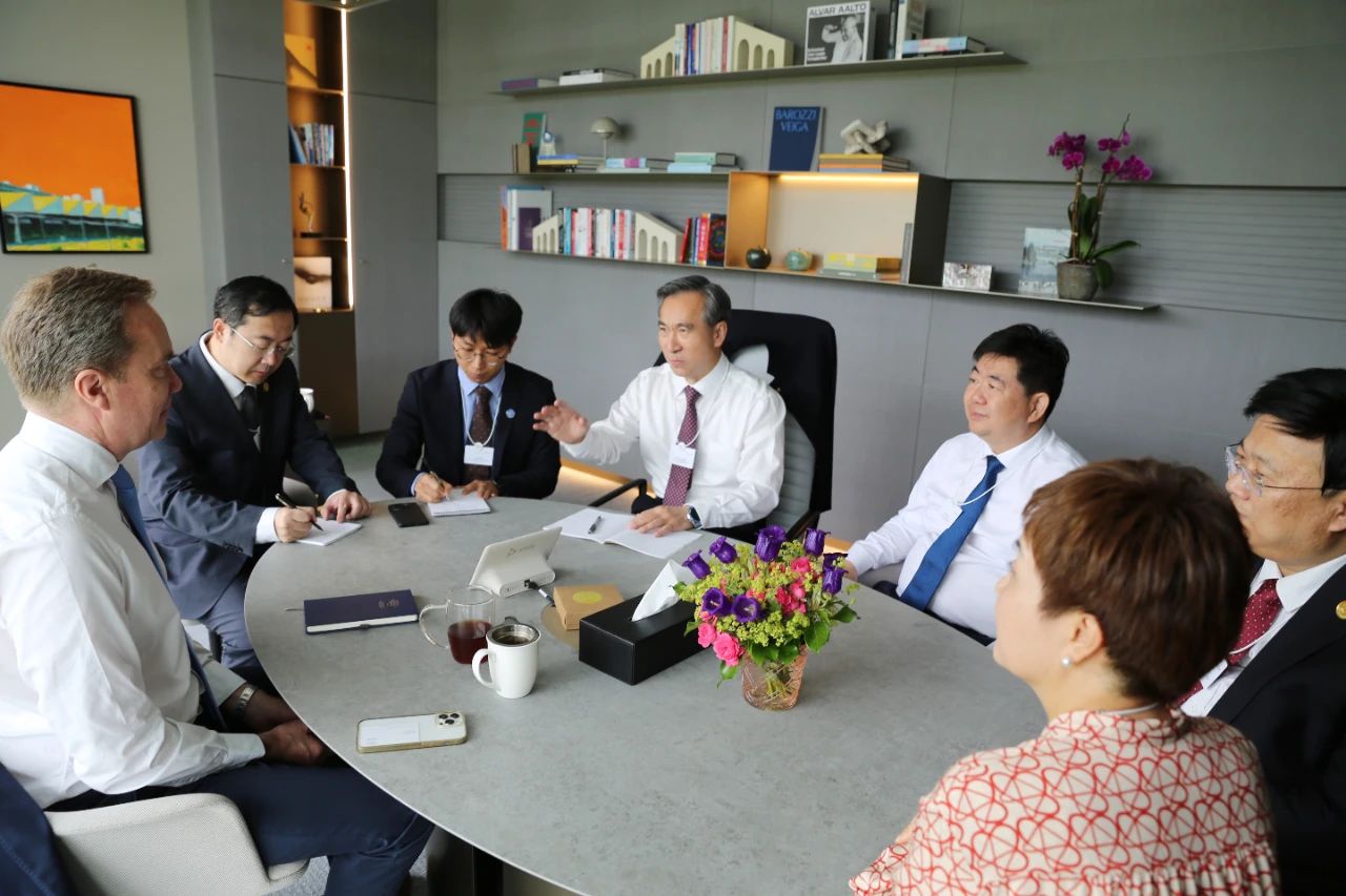 6月17日,中国贸促会会长任鸿斌在瑞士日内瓦会见世界经济论坛总裁布伦德,双方围绕国际经济形势、深化全球工商界交流合作、促进全球经济贸易复苏及达沃斯论坛、链博会等议题进行了友好交流。
