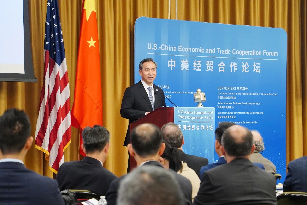 当地时间7月29日,在中国贸促会会长任鸿斌率中国企业家代表团访问美国期间,中国—美国经贸合作论坛在纽约举行。中国贸促会会长任鸿斌,中国驻纽约总领事馆总领事黄屏,国际谅解商务委员会总裁兼首席执行官彼得·提察恩斯基,亚美商业发展中心总裁王章华,美国国际工商理事会首席执行官戴克兰·达利,美国中国总商会会长、中国银行美国地区行长胡威等出席并致辞,300余位中美企业及商协会代表出席。