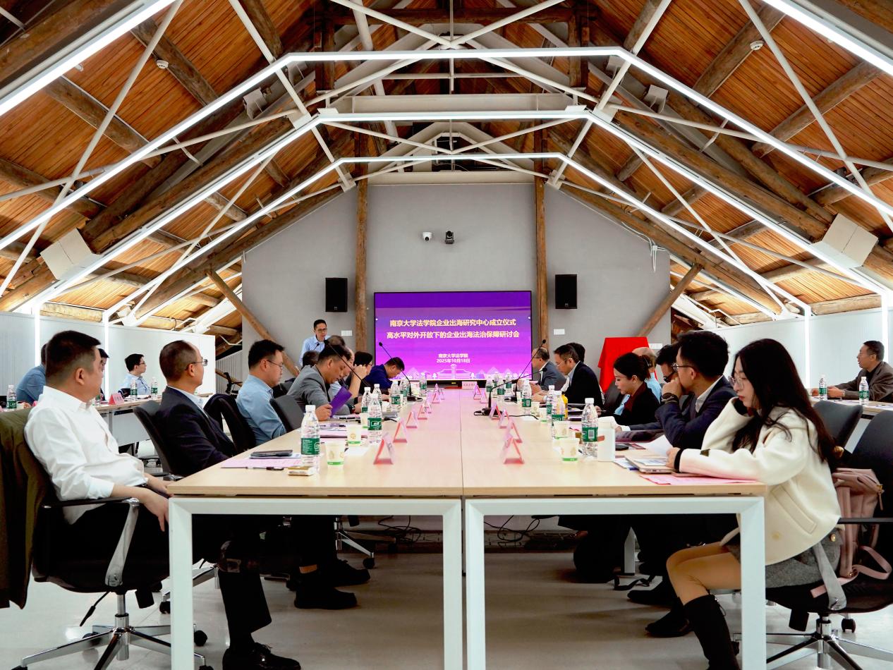 成立仪式结束后,进行了“高质量对外开放下的企业出海法治保障”专题研讨会。江苏省高级人民法院民四庭副庭长陈亮、南京海关法规处副处长李景波、江苏海外集团国际技术工程有限公司副总经理徐春江、南京大学法学院助理研究员王倩慧和京师南京律师事务所涉外业务部主任徐正杨等多位嘉宾先后作了分享。