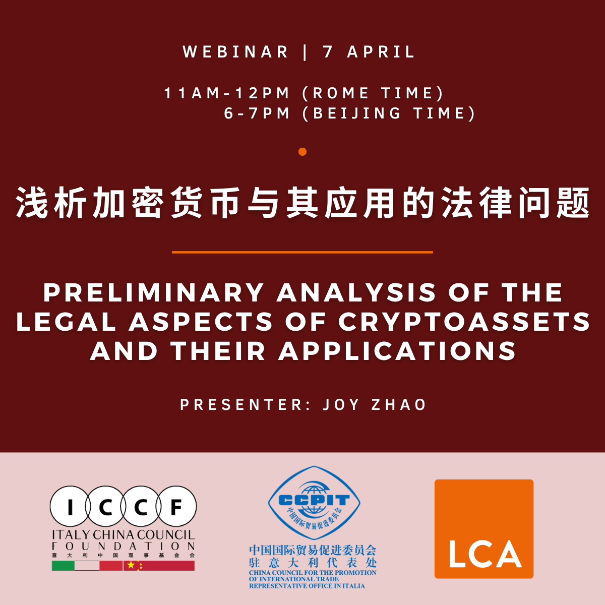由中国贸促会驻意大利代表处、意中理事基金会、意大利LCA律师事务所联合举办的“浅析加密货币与其应用的法律问题”线上讲座将于意大利时间4月7日上午11点举行。 此次线上讲座将围绕加密货币的国际立法,类型,法律性质等展开阐述,分析加密货币与普通货币的区别,加密货币与反洗钱相关规定,介绍欧盟各国监管办法,以及现实案例分享。