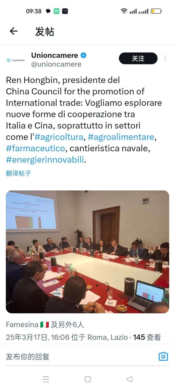 意大利商会联合会在社交媒体X(推特)官方账号报道任鸿斌会长与意大利商会联合会主席普莱特的会见。中国贸促会会长任鸿斌:我们希望在中意之间探索新的合作模式,特别是在农食产品、生物医药、船舶制造、新能源等领域。